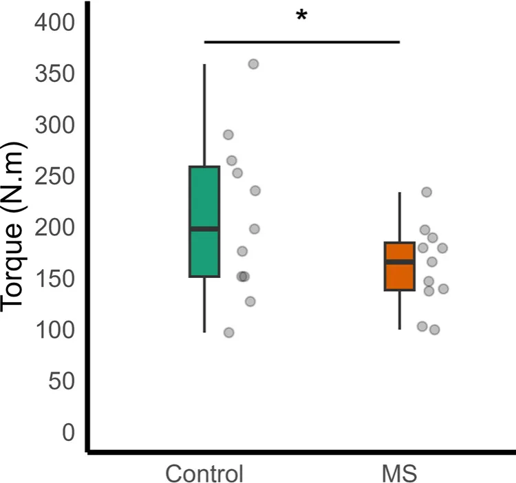 本研究比较了13名复发缓解型MS患者与年龄、性别、身高匹配的健康对照组在执行30%、50%和70%最大自愿收缩(MVC)的等长膝伸展任务中的运动单位放电特性和扭矩稳定性。所有任务均在疲劳前和疲劳后(通过持续MVC使扭矩下降至基线MVC的60%)进行。结果显示,MS组的最大膝伸展扭矩较对照组低23%(P = 0.042),在基线收缩中运动单位放电率低0.88 pps(P = 0.003),扭矩变异系数(CV)高0.014(P = 0.006)。疲劳后,MS组的任务失败时间缩短19.3秒(P < 0.001),放电率进一步降低0.95 pps(P = 0.002),扭矩CV增加0.039(P < 0.001)。