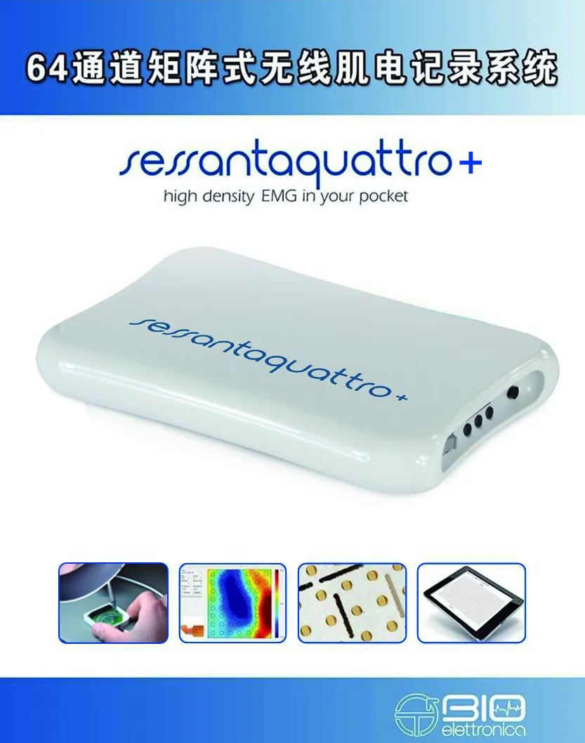 本研究中所使用的肌电信号采集系统为意大利OT Bioelettronica公司研发发Sessantaquattro+ 高密度肌电采集系统。该系统是一款专业级生物电信号采集设备,支持多达64通道的高密度肌电信号同步采集,具有高分辨率、高采样率和低噪声的优异特性,能够精确捕捉肌肉细微区域的电生理活动特征。
