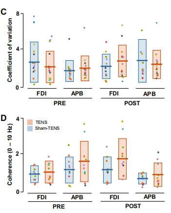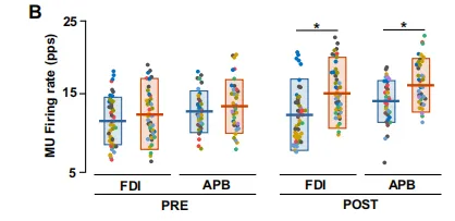 运动单位活动:TENS后FDI和APB运动单位平均放电率显著升高(FDI: 15.6 vs. 12.1 pps; APB: 14.1 vs. 12.1 pps),而力量稳定性和运动单位相干性未发生显著变化(图4C、D)。