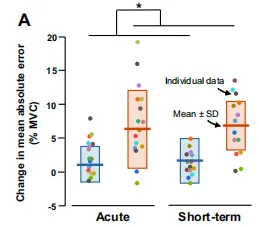 感知误差变化:TENS期间力量与位置感知均出现显著误差,但仅力量感知在刺激后仍显著高于假刺激组(图3A、B)。