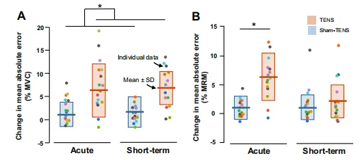 本研究通过两项随机对照实验,评估了单次20分钟TENS对15名健康成年人力量、位置、触觉感知及运动单位放电活动的影响。实验1评估力量感知,实验2评估位置感知,两种实验均包含TENS组和假刺激组。结果显示,TENS期间所有感知均出现偏差,但仅力量感知在刺激后仍持续受损(图3A)。