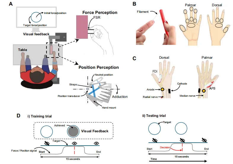 研究采用双盲随机设计,每名参与者完成两次实验,分别接受TENS或假刺激。力量感知通过捏力匹配任务评估,位置感知通过腕部尺偏旋转匹配任务评估,触觉感知采用Semmes-Weinstein单丝测试。